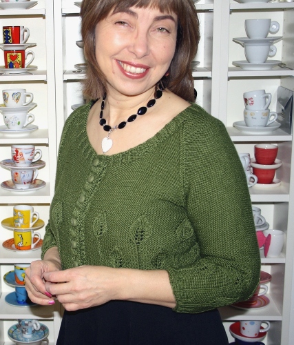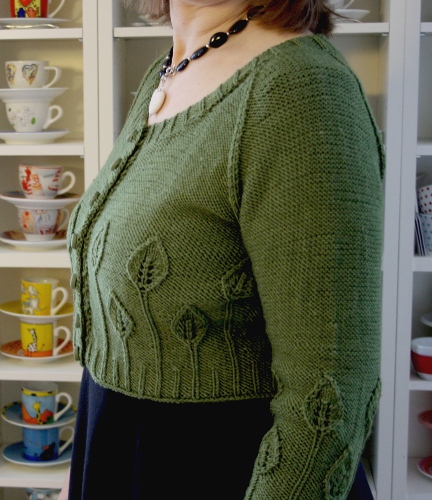 Tätä pikkuneuletta on kiva käyttää mekkojen kanssa. Mielessäni pyöri pitkään joustinneuleesta kasvavien, selkeästi nurjasta neulepohjasta erottuvien lehtien ajatus. Ensimmäistä versiota neuleesta tein ihanalla ja ainutlaatuisella matkalla ystävättäreni kanssa Prahaan: siitä nimi.
