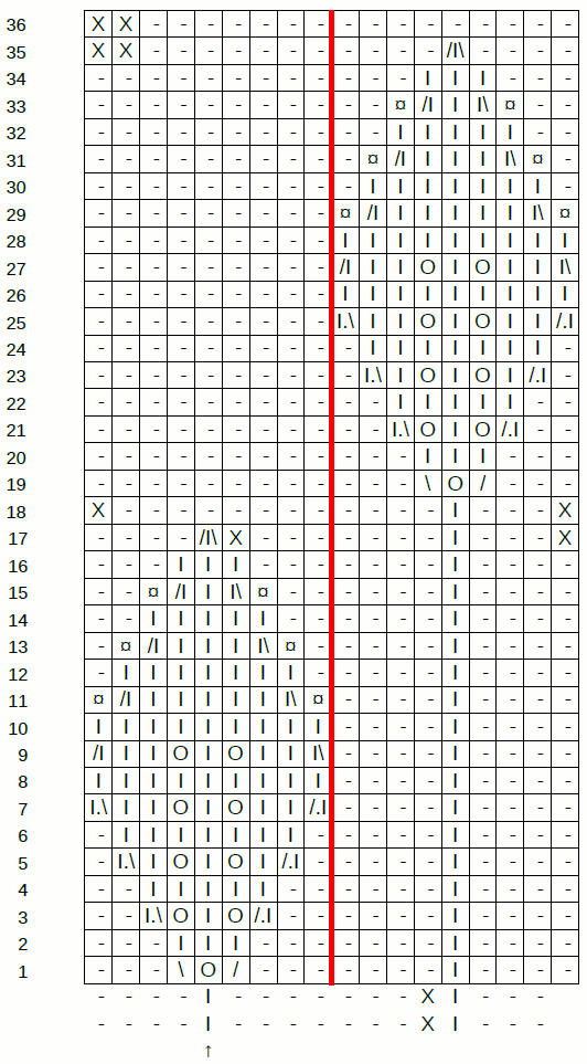 Aloita lehtikuvio työn 21. krs:lla mallipiirroksen riviltä 1. (Kaavion alla on ruuduttamattomassa tilassa pari 7 n, 1 o -kerrosta vain osoittamassa, miten mallineule jatkuu siitä eteenpäin) Neulo 6 s nurin, ja aloita mallineule. Etukappaleilla reunimmaiseksi tulee pitkävartinen lehti. Huomioi sivusaumoihin lisätyt silmukat. Kaavion jälkeen neulo sileää nurjaa.