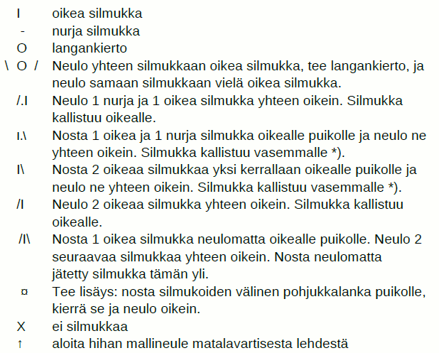 3. krs (nurja puoli): 2 o, *1 n, 3 o*, toista ** kunnes jäljellä on 3 s, ja neulo 1 n, 2 o