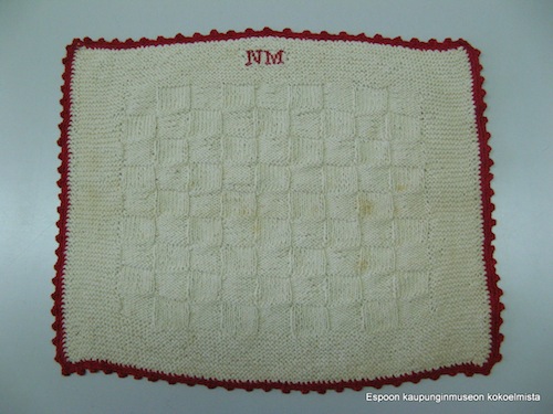 Myös nykyään suosittu tiskirätti esiintyi kokoelmissa sata vuotta vanhana inkarnaationa. Bensulsin talossa asui 1800-1900 -luvun taitteessa rouva Malmström ja hänen kolme vanhapiikatytärtään. Talosta on säilynyt runsaasti tekstiilejä, esimerkiksi yllä oleva pölypyyhe. Huolellisesti viimeisteltyyn pölypyyhkeeseen on erikseen jätetty aina oikein -reunaan sileä oikea tila, johon neiti Naima Malmström on voinut ristipistoin ommella nimikoinnin. Punainen nirkkoreunus on virkattu.