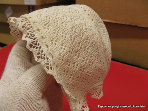 Kuvassa näkee sekä suojahansikkaan että palan historiaa. Kädessä oleva Bodomin kartanosta peräisin oleva 1900-luvun alussa tehty vastasyntyneen pitsimyssy on neuletiheydeltään lähellä teollisesti valmistetun puuvillahansikkaan tiheyttä. Aluksi pohdimmekin, että myssy on varmaan ostettu. Tarkempi tutkiminen kuitenkin osoitti, että myssyn vuorikangas oli selvästi käsin kiinnitetty, ja neulepinnastakin löytyi yksi pieni virhe. Myssyn reunapitsi on nyplättyä pitsiä, mutta muuten myssy on neulottu.