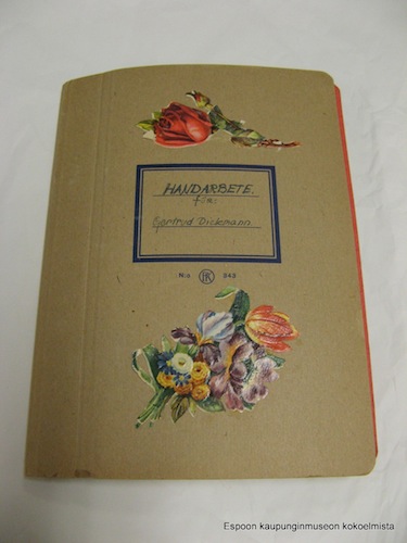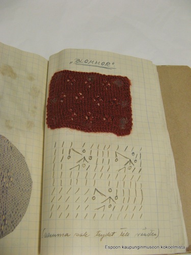 Paitsi tekstiilejä, oli kokoelmassa myös käsityöaiheisia muistiinpanoja. Erityisen viehättävä oli tytön käsityövihko, jonka sisäsivuilta löytyi neulottuja mallitilkkuja sekä pintaneuleista tehtyjä muistiinpanoja.