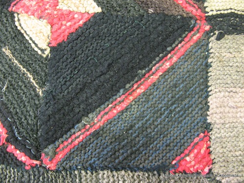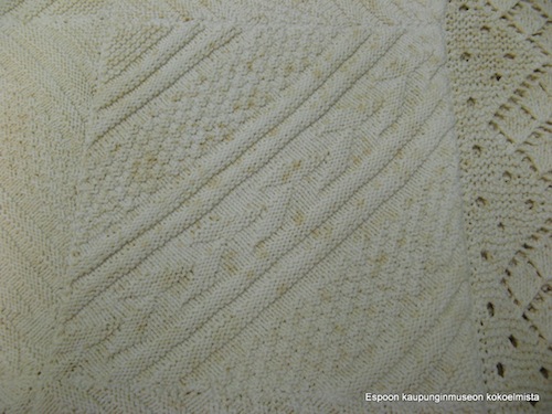 Päiväpeite oli koottu neliöistä, joiden oikein ja nurjin silmukoin tehdyt kuvioinnit saattaisivat olla peräisin mistä tahansa modernista mallineulekirjasta. Peite oli luultavasti vanhin vierailulla nähdyistä neuleista. Kuvan neliön koko on muuten noin 16x16 cm, joten lanka on ollut suurin piirtein saman paksuista kuin Novitan Nalle nykyään. Useita vuosikymmeniä tuoreempi neulottu kynnysmatto oli melkoinen kontrasti hienolle päiväpeitteelle. Kulmasta kulmaan neulomisen tekniikka on sama, mutta matonkuteesta neulottujen aina oikein -neliöiden luoma vaikutelma on hyvin erilainen.