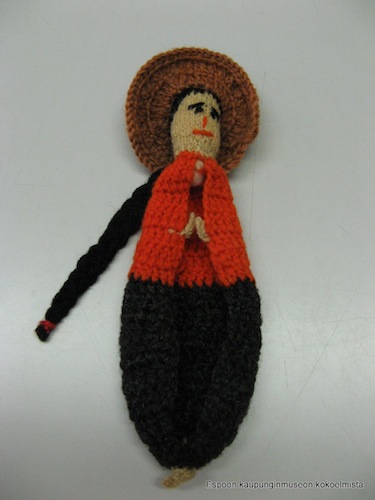 Osa museoneuleista oli modernille neulojalle tuttuja, osa taas sellaisia käyttöesineitä, joita ei enää nykyään näe. Esimerkiksi kuvan suojuke oli sekä sanana että esineenä aivan uusi tuttavuus. Kiinalaisen hahmon vartalo ja hattu on virkattu, pää on neulottu ja täytetty pumpulilla. Suojuke laitettiin kuparisen kahvipannun kuuman kahvan suojaksi. Samassa laatikossa oli monilla muillakin tekniikoilla tehtyjä suojukkeita, esimerkiksi kenties lapsen koulutyönä ompelema huopakankainen kana.