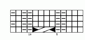 1. krs (op): *nosta 1 s neulomatta, 1 o*, toista *-* 4 kertaa, 1 n, nosta 2 s apupuikolle työn taakse, 2 o, apupuikon silmukat o, 1 n, nosta 2 s apupuikolle työn eteen, 2 o, apupuikon silmukat o, 1 n, *1 o, nosta 1 s neulomatta*, toista *-* 3 kertaa, 2 o.