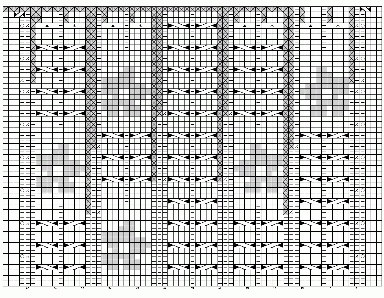 Jatka neulomista kaavion 1 mukaan, nosta työn oikealla puolella reunasilmukka neulomatta ja neulo nurjan puolen reunasilmukka oikein. Neulo reunusta, kunnes se on 26-28 cm tai haluamasi pituinen, kuitenkin vähintään 68 krs. Neulo viimeiseksi kaavion 2. krs ja tee sitten vielä kaksi kerrosta seuraavasti: