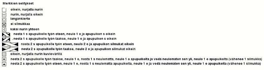 3. krs (op): *nosta 1 s neulomatta, 1 o*, toista *-* 4 kertaa, 1 n, 4 o, 1 n, 4 o, 1 n, *1 o, nosta 1 s neulomatta*, toista *-* 3 kertaa, 2 o.