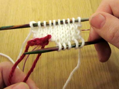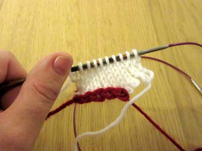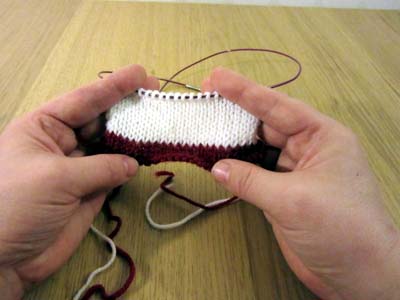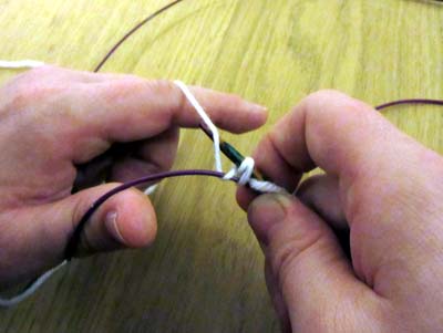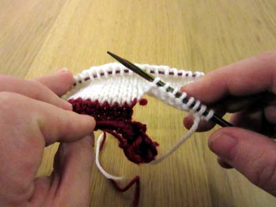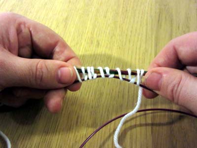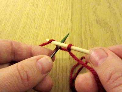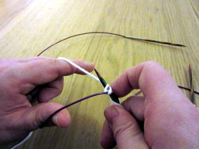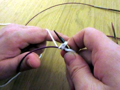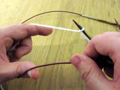 Kolmas tapa tehdä väliaikainen aloitus on luoda silmukat samaan aikaan työn varsinaiselle puikolle ja odottamaan jäävän pyöröpuikon kaapelille.