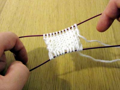 Tätä väliaikaista aloitusta ei pureta. Kun on aika ottaa väliaikaisen aloituksen silmukat mukaan työhön, vie odottavat silmukat pyöröpuikon kärkeen ja aloita neulominen.