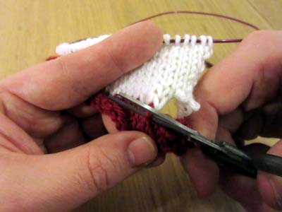Neulottu väliaikainen aloitus puretaan leikkaamalla apulangalla neulottu osuus irti teräväkärkisillä käsityösaksilla.