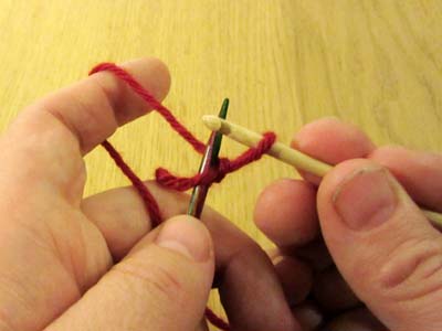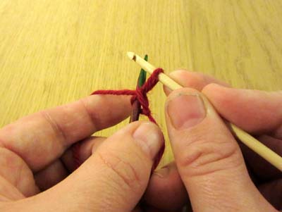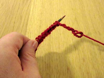 Tee apulangalla vetosolmu ja poimi se virkkuukoukulle aloitussilmukaksi. Ota neulepuikko vasempaan käteesi ja vie lanka puikon ali. Koukkaa lanka virkkuukoukulle puikon yli ja vedä aloitussilmukan läpi kuin ketjusilmukoita virkaten. Vie työn lanka puikon kärjen edestä puikon ali ja koukkaa jälleen virkkuukoukulle puikon yli. Toista, kunnes puikolla on haluttu määrä apulangalla luotuja silmukoita. Virkkaa vielä muutaman silmukan mittainen ketjusilmukkaketju. Vedä apulangan pää viimeisen ketjusilmukan läpi, mutta älä kiristä tiukalle.