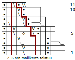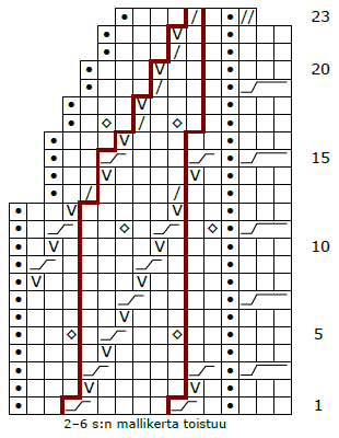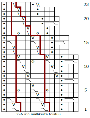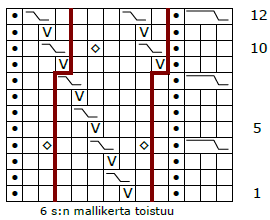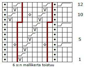 Jatka neulomista oikean kämmenkaavion mukaan. Kuuden silmukan mallikerta toistuu kahdeksan kertaa. Neulo kaavion kerrokset 1–12 kolme kertaa ja sen jälkeen kerrokset 1–5 kerran.