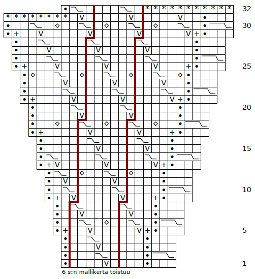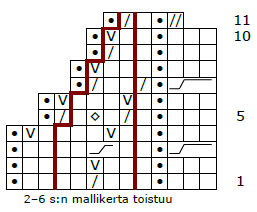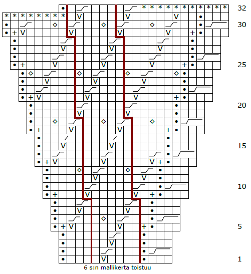 Neulo oikean kiilakaavion mukaan. Huomaa, että kaavioon merkitty kuuden silmukan mallikerta toistuu kaikkiaan kahdeksan kertaa. Kun olet tehnyt kaikki lisäykset, työssä on 70 s.