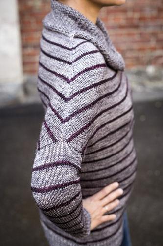 Toista kavennuskrs joka toinen krs vielä 16 krt (68 s kavennettu), työssä on 154 – 174 – 196 – 218 – 238 – 258 – 278 s. Jatka sileää neuletta ja raitamallineuletta noin 14 – 14 – 14 – 14 – 8 – 4 – 2 krs (voit jatkaa enemmänkin, jos haluat tehdä pidentää osiota ennen lisäyksiä).