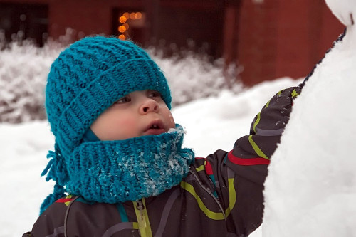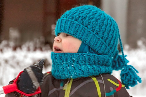 Pieni mutta isopäinen poikani toivoi joulupukilta uutta myssyä ja kauluria. Vanhat kun alkoivat olla jo varsin kuluneet. Koska meillä päin -30 asteen pakkaset ovat jokatalvinen ilmiö (höystettynä purevalla tuulella), piti projektia harkita tarkoin. Vaatekappaleiden piti täyttää kolme vaatimusta: niiden piti olla tuulenpitäviä, hengittäviä ja silti lämpimiä. Langaksi valikoitui Dropsin Andes. Paksu lanka ja verrattain ohuet puikot tekevät piposta tuulenpitävän. Kaksinkertainen resori taas takaa lämpimyyden ja alpakan villa hengittävyyden. Kokoja näihin tamineisiin on kolme.