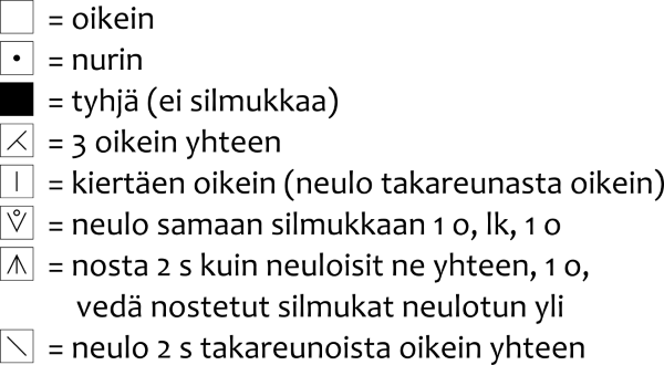 Luo koon 7 – 7 – 9 mm puikoille 56 – 60 – 64 s. Neulo 1 kiertäen o, 1 n -joustinneuletta 3 – 3 – 4 cm. Aloita kaavio 1 ja toista mallikertaa yhteensä 14 – 15 – 16 kertaa. Neulo kaavion krs:t 1–6 2 – 2 – 3 krt. Jatka sitten joustinneuletta 3 – 3 – 4cm. Päättele silmukat seuraavasti: neulo 1 kiertäen o, *1 n, siirrä silmukat vasemmalle puikolle ja neulo ne takareunoistaan oikein yhteen, 1 kiertäen o, siirrä silmukat vasemmalle puikolle ja neulo ne takareunoistaan oikein yhteen*. Toista *–* krs:n loppuun. Katkaise lanka, vedä se viimeisen silmukan läpi ja kiristä. Päättele langanpäät ja höyrytä työ.