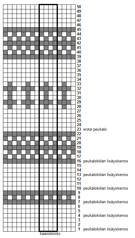 Joustinneuleen jälkeen neulo 1 krs oikein kontrastivärillä. Vaihda seuraavalla kerroksella pääväriin, neulo kuviota kaavion tai sanallisen ohjeen mukaan ja aloita samalla peukalokiila alla olevien ohjeiden mukaan.