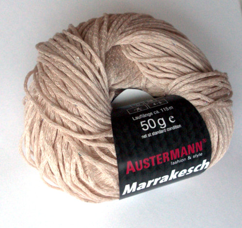 Marrakesch on Austermannin kevään uutuuslankoja. Viskoosi-polyesterisekoitteena se onkin sopiva kevät- ja kesäneuleisiin. Mielenkiintoiseksi Marrakeschin tekee siinä mukana olevat paljetit. Lanka-arvostelua varten sain käsiini varsin hillityn värin nimeltään Natur, josta paljetit erottuvat oikeastaan vain jos niitä osaa neulepinnasta etsiä. Kerällä paljetit erottuvat selvästi paremmin kuin mallitilkussa.