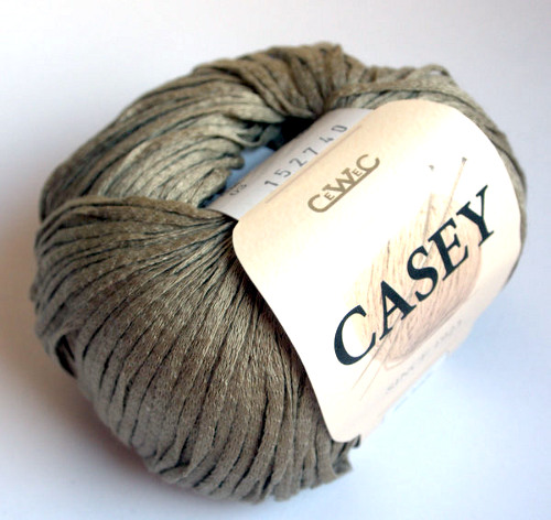 Casey on kesäinen nauhalanka, jonka koostumuksessa on puolet puuvillaa ja puolet akryyliä. Kerällä lanka näyttää kiiltävältä ja hyvin ohuelta. Siksi en uskonut vyötteen puikkosuositusta 4,5–5 mm, vaan tartuin 3,5 mm:n puikkoihin. Valinta oli mielestäni aivan sopiva, koska mallitilkun neulepinnasta tuli hyvin laskeutuva. Langan litteän rakenteen vuoksi neuleesta ei varmaan saisi mitenkään kovin tiivistä. Tiheydellä 20 s = 10 cm tilkku soveltuisi paremmin kesäiseen huiviin kuin toppiin. Yllättäen lanka ei neulottuna näytä enää yhtä kiiltävältä kuin kerällä.