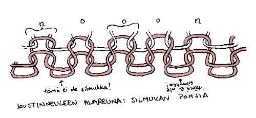 Joustinneuleen alareuna (kuva 1) ei ole silmukkarivi. Katso merkittyjä lankalenkkejä tarkasti: lenkin vasemmanpuoleinen lanka menee edellisen kerroksen lenkkiin eri puolelta kuin oikeanpuoleinen lanka, toinen päältä ja toinen alta. Lenkit ovatkin itse asiassa silmukan pohjia (pohjukkalankoja). Vierekkäisten lankalenkkien vierekkäiset langat muodostavat yhden silmukan, kuten kuvaan on merkitty.
