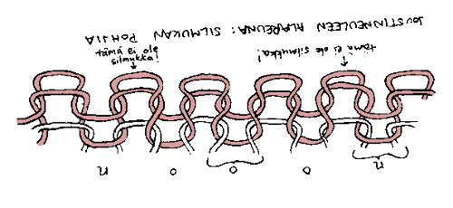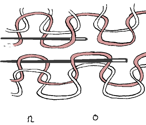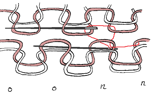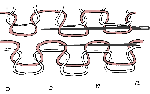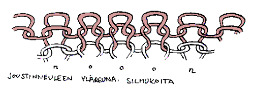 Alempi neulanpisto tehdään ensin, ylempi sitten. Silmukoidessa käytetty lanka on selvyyden vuoksi jätetty piirtämättä.