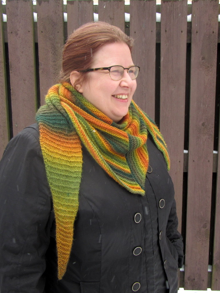 Epäsymmetrinen huivi neulotaan kahdessa osassa: ensimmäinen osa neulotaan kulmasta alkaen lisäten toisessa reunassa joka neljännellä kerroksella. Toinen osa muotoillaan lyhennetyin kerroksin lisäten työn vastakkaisessa reunassa joka toisella kerroksella. Huivin korkein kohta ei osu aivan keskikohtaan, vaan ensimmäinen osio on hieman lyhennetyin kerroksin neulottua osiota pidempi.