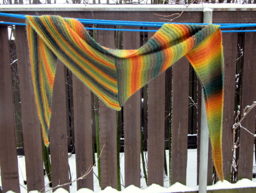 Kastele huivi läpikotaisin. Purista sitten ylimääräinen vesi pois ja muotoile kostea työ mittoihinsa tasoon kuivumaan. Huivin ensimmäistä puoliskoa kannattaa venyttää enemmän leveyssuunnassa ja toista enemmän pituussuunnassa. Tässä vaiheessa voit halutessasi toisaalta myös korostaa epäsymmetristä vaikutelmaa ja muotoilla huivin toisen puoliskon päättelyreunan kaarevaksi.