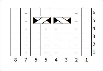 2. krs: Nosta 1 silmukka nurin, neulo 5 silmukkaa nurin, neulo 2 s nurin yhteen, neulo 1 s nurin, käänny.