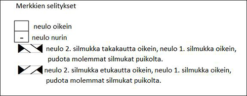 knk Kahden noston kavennus. Nosta silmukka oikein neulomatta, nosta toinen silmukka oikein neulomatta, siirrä silmukat takaisin puikolle ja neulo ne takareunasta oikein yhteen. 2 o yht Neulo kaksi silmukkaa oikein yhteen.