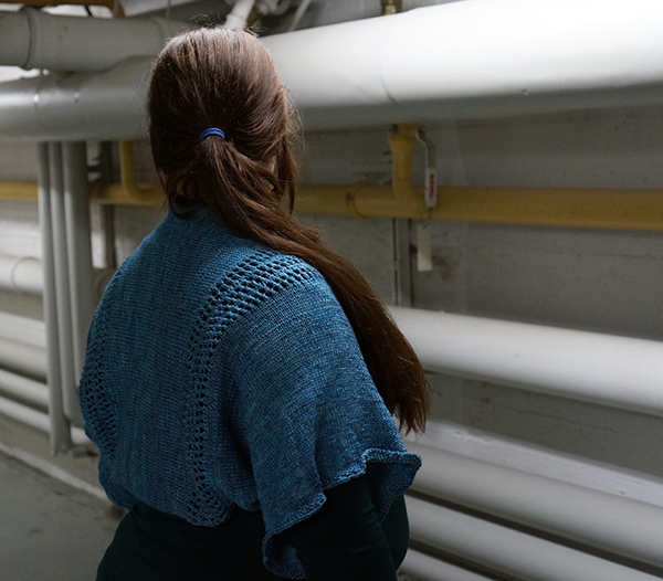Jatka sileän neuleen neulomista kolmannen pitsikuviotoiston jälkeen, kunnes kappaleen pituus on 54 cm. Seuraavalla sileän puolen kerroksella nosta ensimmäinen silmukka, neulo 1, neulo 2 oikein yhteen, neulo sileää oikeaa, kunnes puikolla on 4 silmukkaa, neulo 2 oikein yhteen, neulo 2 silmukkaa.