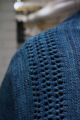 Seuraavalla oikean puolen kerroksella, nosta 1, neulo 1 oikein, *langankierto, nosta 2 silmukkaa, neulo ne takareunasta yhteen*, toista *-* kunnes puikolla on 2 silmukkaa. Neulo 2 viimeistä silmukkaa. Neulo nurjan puolen kerrokselle kaikki silmukat nurin, niin että nostat ensimmäisen silmukan neulomatta. Seuraavalla kierroksella nosta 1, neulo yksi, nosta 3 silmukkaan, neulo ne takareunasta yhteen, langankierto, *nosta 2 silmukkaa, neulo ne takareunasta yhteen, langankierto*, toista *-* kunnes puikolla on 5 silmukkaa, nosta 3 silmukkaa, neulo ne takareunasta yhteen, neulo 2.