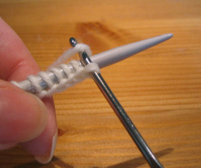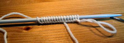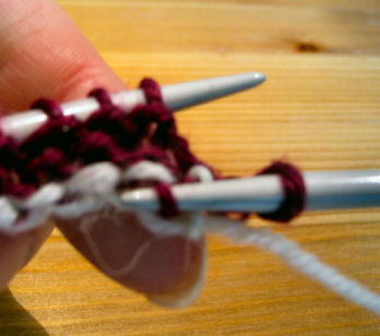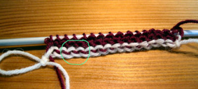 Kiinnitä huomio vihreällä ympyrällä merkittyyn kohtaan. Aloituslangan seasta näyttää pilkistävän pieniä lenkkejä. Seuraavaksi poimitaan näitä lenkkejä puikolle jo olevien silmukoiden seuraksi. Tee näin: neulo ensimmäinen silmukka nurin, seuraavaksi pujota puikon kärki yläkautta lenkin alle ja poimi se vasemmalle puikolle ja neulo se oikein. Neulo seuraava silmukka puikolta nurin, poimi sitten taas lenkki puikolle ja neulo se oikein. Jatka, kunnes olet päässyt kerroksen loppuun. Ensimmäisen kerroksen jälkeen voi jo poistaa aloituslangan, mutta se on ehkä mukavampi poistaa vasta, kun olet neulonut muutaman kerroksen. Lanka poistetaan avaamalla ketjusilmukkarivi lopetuspäästä. Vedä nyt lankaa, näyttää siltä kuin se olisi neuleen sisällä.