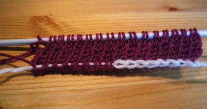 Ota varsinainen neulelanka ja neulo kolme kerrosta seuraavasti: 1. kerros oikein, 2. kerros nurin, 3. kerros oikein. Tämän jälkeen tilanne näyttää seuraavalta: