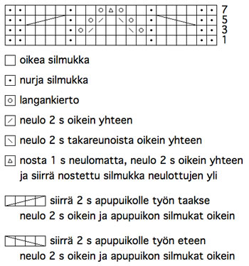 1. krs: Neulo 1 s, tee langankierto etukautta, *neulo 5 s. Nosta vasemman puikon avulla 2., 3., 4. ja 5. silmukka oikealla puikolla ensimmäisenä olevan ylitse. Tee langankierto etukautta.* Toista *–* kappaleen loppuun, neulo viimeinen silmukka oikein. 2. krs: Neulo 1 s oikein, *neulo seuraavaan silmukkaan (edellisen kerroksen langankierto) 1 n, langankierto etukautta ja 1 kiertäen oikein, neulo 1 nurin*. Toista *–*, neulo viimeinen s oikein. 3. krs: Neulo 2 oikein, seuraava (edellisen kerroksen langankierto) kiertäen oikein, *3 oikein, seuraava kiertäen oikein*, jatka *–* kunnes jäljellä on 2 s, neulo 2 oikein. 4.-6. krs: Neulo kaikki silmukat oikein. Mittaa työn pituus aina koristereunuksen nirkon kärjestä. TakakappaleLuo ohuemmille puikoille 72 – 77 – 82 – 87 s. Neulo koristereunus ohjeen mukaan. Helmakuvion neulomisen jälkeen työssä on 61 – 65 – 69 – 73 s. Vaihda työhön paksummat puikot ja neulo sileää neuletta. Kun kappaleen korkeus on 30 – 32 – 34 – 36 cm, päätä keskimmäiset 21 – 23 – 25 – 27 s pääntietä varten. Neulo olat erikseen. Päätä olkaa neuloessasi pääntien reunasta vielä 1x2 s. Kun kappaleen korkeus on 31 – 33 – 35 – 37 cm, päätä olan silmukat. EtukappaleNeulo koristereunus kuten takakappaleessa. Vaihda työhön paksummat puikot ja neulo 20 – 22 – 24 – 26 s oikein, pitsikuviota ruutupiirroksen mukaan 21 s ja loput 20 – 22 – 24 – 26 s oikein. Jatka ruutupiirrosta kuvion mukaan ja neulo lopuilla silmukoilla sileää neuletta, kunnes kappaleen korkeus on 29 – 31 – 33 – 35 cm. Päätä keskimmäiset 19 – 21 – 23 – 25 s pääntietä varten. Neulo olat erikseen. Päätä olkaa neuloessasi pääntien reunasta joka toinen kerros vielä 1x2 ja 1x1 s. Kun olan korkeus on sama kuin takana, päätä silmukat. HihatLuo ohuemmille puikoille 32 – 37 – 37 – 42 s. Neulo koristereunus ohjeen mukaan. Kuvion neulomisen jälkeen työssä on 29 – 33 – 33 – 37 s. Vaihda työhön paksummat puikot ja jatka sileää neuletta. Lisää työn molemmissa reunoissa 1 s joka 4. krs 9 – 10 – 12 – 14 kertaa, kunnes työssä on 47 – 53 – 57 – 65 silmukkaa. Kun hihan pituus on 16 – 18 – 20 – 22 cm, päätä silmukat kerralla. Neulo toinen hiha samoin. ViimeistelyHalutessasi kostuta kappaleet ja levitä ne mittoihinsa kuivumaan. Ompele toinen olkasauma. Poimi pääntien reunasta ohuemmille puikoille 66 – 70 – 74 – 78 s. Neulo 4 kerrosta joustinneuletta: neulo 1 oikein, *2 oikein, 2 nurin*, 1 oikein. Neulo sitten vielä 4 kerrosta sileää oikeaa neuletta. Päätä pääntien silmukat löysästi. Ompele toinenkin olkasauma, kiinnitä hihat ja ompele hiha- ja sivusaumat. Kaavio