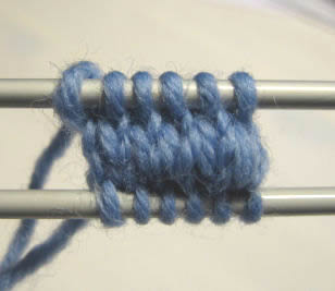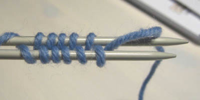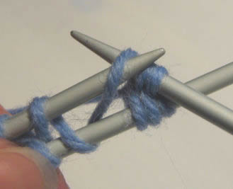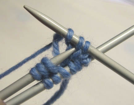 Huom: toisen puikon silmukat ovat puikolla väärin päin, eli neulo ne takareunastaan oikein. |
