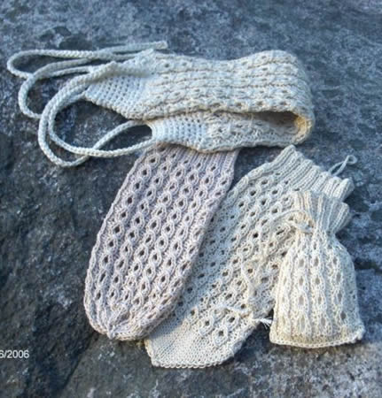 OhjeetPesukinnas 1(Kuvassa oikealla): neulotaan kuten peukaloton lapanen. Luo kalastajanlangalla 56 silmukkaa 3 mm:n sukkapuikoille ja jätä n. 40 cm pitkä aloituslanka. Jaa silmukat siten, että jokaisella puikolla on neljällä jaollinen määrä silmukoita, esim. 12-16-12-16. Neulo sitten 2 o, 2 n joustinta 11 kerrosta (viimeinen joustinneulekerros on samalla mallineuleen ensimmäinen kerros). Neulo mallineuletta 11 mallikertaa (55 kerrosta). Neulo sileää 1 kerros ja tee sitten kärkikavennukset: Tee ensimmäisen ja kolmannen puikon alussa ylivetämiskavennus, ja toisen ja neljännen puikon lopussa neulo 2 s oikein yhteen = yhteenneulomiskavennus. Tee kavennukset joka kerroksella, kunnes jokaisella puikolla on jäljellä 1 silmukka. Vedä lanka näiden 4 silmukan läpi ja kiristä silmukat yhteen. Päättele langanpää huolellisesti pujottelemalla se päättelysilmukoiden sisään parsinneulalla. Virkkaa 3 mm:n koukulla aloituslanganpätkästä ketjusilmukoilla sopivan mittainen ripustuslenkki ja kiinnitä sen toinen pää piilosilmukalla 5 mm:n päähän aloituksesta. Kiristä lanka ja päättele se huolellisesti pesukintaan nurjalle puolelle. Pesukinnas 2(Kuvassa vasemmalla): neulotaan kuten peukaloton lapanen Luo Tennesseellä 56 silmukkaa 3 mm:n sukkapuikoille ja jätä n. 40 cm pitkä aloituslanka. Jaa silmukat siten, että jokaisella puikolla on neljällä jaollinen määrä silmukoita, esim. 12-16-12-16. Neulo sitten 2 o, 2 n joustinta 19 kerrosta (viimeinen joustinneulekerros on samalla mallineuleen ensimmäinen kerros). Neulo mallineuletta 11 mallikertaa (55 kerrosta). Neulo sileää 1 kerros ja jaa samalla silmukat tasaisesti sukkapuikoille, 14 silmukkaa puikolleen. Tee kärkikavennukset: kavenna joka kerroksella jokaisen puikon alussa ja keskellä neulomalla 2 s oikein yhteen. Kun jokaisella puikolla on jäljellä enää 1 silmukka, vedä lanka näiden 4 silmukan läpi ja kiristä silmukat yhteen. Päättele langanpää huolellisesti pujottelemalla se päättelysilmukoiden sisään parsineulalla. Virkkaa 3 mm:n koukulla aloituslanganpätkästä ketjusilmukoilla sopivan mittainen ripustuslenkki ja kiinnitä sen toinen pää piilosilmukalla 5 mm:n päähän aloituksesta. Kiristä lanka ja päättele se huolellisesti pesukintaan nurjalle puolelle. Selänpesin