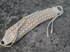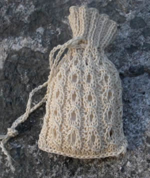 Selänpesimen keskiosa: Luo kalastajanlangalla ja puuvillalangalla 40 silmukkaa 4 mm:n sukkapuikoille. Jaa silmukat siten, että jokaisella puikolla on neljällä jaollinen määrä silmukoita, esim. 8-12-8-12. Neulo sitten sileää neuletta 3 kerrosta ja aloita mallineule. Neulo mallineuletta 14 mallikertaa tai haluamasi pituus (esimerkkipesimen keskiosan pituus on 32 cm). Neulo vielä kaksi kerrosta sileää ja seuraavalla kerroksella päättele neule löyhästi haluamallasi tavalla. Esimerkkineuleen silmukat on päätelty ylivetämällä. Kädensijat: Virkkaa neuleen toisen pään reunaan 4 mm:n virkkuukoukulla 40 kiinteää silmukkaa kaksinkertaisella puuvillalangalla (jätä aloituslanka roikkumaan neuleen oikealle puolelle aloituskohdan merkiksi), ja jatka virkkaamalla kiinteitä silmukoita. Älä päätä kerroksia vaan virkkaa spiraalina. Toisella virkkauskerroksella kavenna joka neljäs silmukka virkkaamalla aina joka kolmas ja neljäs silmukka yhteen, kerroksen päättyessä työssä on 30 kiinteää silmukkaa. Virkkaa näillä yksi kerros kaventamatta, ja seuraavalla (neljännellä) kerroksella kavenna taas joka kolmas silmukka virkkaamalla aina joka toinen ja kolmas silmukka yhteen, kerroksen päättyessä työssä on 20 kiinteää silmukkaa. Jatka näillä 20 silmukalla virkkausta vielä neljä kerrosta. Virkkaa sitten 50 kpl ketjusilmukoita, käänny, jätä 2 kjs väliin ja palaa ketjua takaisin virkkaamalla piilosilmukka jokaiseen ketjusilmukkaan. Virkkaa kiinteillä silmukoilla vielä avoinna oleva kädensijan "suuaukko" umpeen ottamalla sekä etu- että takareunan silmukat koukulle. Toiseen reunaan päästyäsi virkkaa jälleen 50 ketjusilmukkaa, käänny, jätä 2 kjs väliin ja palaa ketjua takaisin virkkaamalla piilosilmukka jokaiseen ketjusilmukkaan ja varmista piilosilmukalla, että kädensijan nauha on juurestaan tukeva. Vedä lanka silmukan läpi, kiristä ja päättele langat virkkauksen sisälle parsineulalla pujottelemalla. Tee toiseen päähän samanlainen kädensija. Saippuapussi