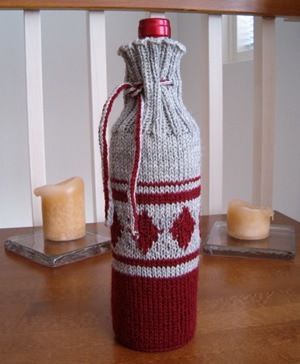Viini-Jussi sai alkunsa, kun mietiskelin Pohjois-Pohjanmaalta kotoisin olevalle kaverille jotain erikoista lahjaksi. No, mikäpä ei näin Duudsonien suosion aikaan sopisi paremmin kuin jussi-kuosi, kun Pohjanmaasta on kyse. Se, mihin jussi-kuosi sitten liitetään, olikin vähän pidemmän miettimisen tulos. Perinteiset viininpunainen ja harmaa ehdottomasti väreiksi, viininpunainen... viini... Siinä se oli, viinipullon suoja. Suoja sopii niin "lahjapaperiksi" kuin pakkaskautena käyttösuojaksikin. Eräs ideointikaverini totesi, että viini-jussi on kesälläkin tarpeellinen: kun suojan kastelee kylmällä vedellä, ei viini lämpene liian nopeasti auringossa. Tuotekehittelyn tuloksena syntyi koko myös Pohjan Poika -pullolle. Lanka ja langan menekki Gjestal Nagano, 35 g, vaaleanharmaa (303) Vähäisen menekin vuoksi voi hyvin hyödyntää myös jämälankoja. Vaihtoehtoisesti Novitan Wool ja Nalle ovat lähellä Naganon paksuutta, puikkokokoa vaihtelemalla pääsee samaan neuletiheyteen. Neuletiheys 21 s ja 30 krs sileää neuletta = 10 cm Puikot Sukkapuikot 3 mm tai käsialan mukaan Koko Tavallisen kokoisen viinipullon ja Pohjan Poika/Koskenkorvapullon suojaksi Koot: Viinipullo (Koskenkorva 0,5 l) Mallineule Ks. kaavio ohjeen lopusta. OhjePohjaVirkkaa viininpunaisella langalla 4 ketjusilmukkaa ja liitä ne ympyräksi piilosilmukalla. 1. kerros: Virkkaa 1 ketjusilmukka ja 5 kiinteää silmukkaa