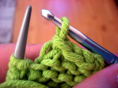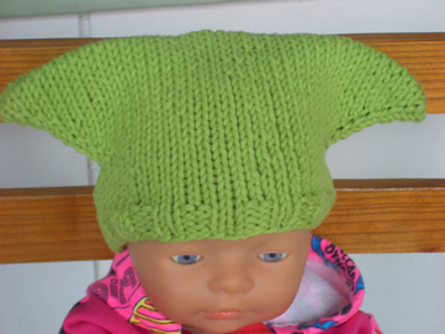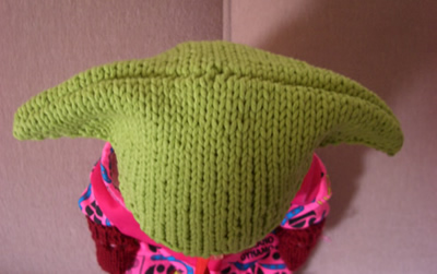Neulo lisäykset joka toisella kerroksella, toista lisäykset 10 kertaa. Näin lopussa puikkoa kohti on 22 (30) silmukkaa. Neulo viimeisen lisäyksen jälkeen vielä 2 kerrosta sileää. Käännä työ niin, että nurja puoli on ulospäin. Siirrä silmukat sukkapuikoille niin, että virkkaamalla saat niistä sauman: aloita oikean laidan puikoista niin, että siirrät etummaiselta puikolta silmukan vapaalle puikolle oikealle, sitten takimmaiselta, etummaiselta. jne., kunnes kaikki silmukat ovat kahdella sukkapuikolla. Virkkaa sauma: vie virkkuukoukku kahden silmukan läpi samalla tavalla kuin nostaisit silmukat puikolle oikein. Vedä lanka silmukoiden läpi, vie virkkuukoukku jälleen kahden silmukan läpi ja vedä lanka kaikkien silmukoiden läpi.