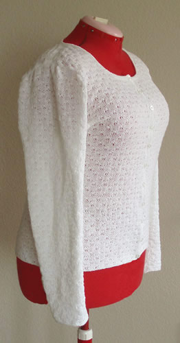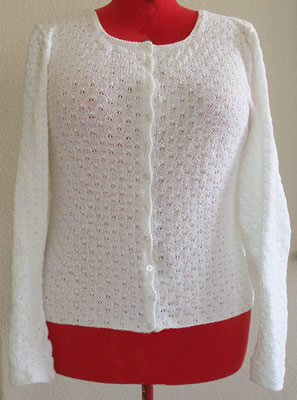Lanka ja langan menekki Novita Kotiväki (200 g = n. 669 m), valkoinen. Kuvien L-kokoiseen neuleeseen kului lankaa 488 g. Puikot 2,25 mm metallinen pyöröpuikko tai käsialan mukaan. Neuletiheys 22 s ja 46 krs = 10 x 10 cm. Muut tarvikkeet 11 pientä nappia, päättelyneula, virkkuukoukku 2 mm. Mallineule