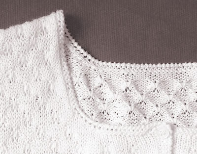 Päättele keskimmäiset 39 s kaula-aukkoa varten, neulo toinen olkapää edellisen peilikuvaksi. Vasen etukappaleLuo 61 s, ja neulo kuten takakappaleessa, mutta tee vyötärönkohdan muotoilut Tee etukappaleen kädentien muotoilut seuraavasti: päättele seuraavien 2 krs:n alussa 7 s, ja seuraavien 2 krs:n alussa 2 s. Kavenna sitten reunasilmukan sisäpuolella molemmissa reunoissa 5 x 1 s joka 2. krs = 46 s. Jatka sitten mallineuleen mukaan ilman muotoiluja, kunnes kappaleen korkeus on 19 mallikertaa. Neulo vielä 9 krs mallineuletta. Tee sitten kaula-aukon muotoilut seuraavasti: päättele seuraavan OP:n krs:n alussa 14 s. Kavenna kaula-aukon reunassa 2 x 2 s ja 1 x 1 s joka 2. krs, ja 1 x 1 s joka 4. krs = 26 s. Jatka mallineuleen mukaan, kunnes kappaleen korkeus on 22 mallikertaa. Neulo vielä 9 krs mallineuleen mukaan. Tee sitten olat lyhennetyin kerroksin kuten takakappaleessa, mutta ilman kaula-aukon kavennuksia. Yhdistä olka takakappaleeseen 3 puikon päättelyllä. Neulo oikea etukappale vasemman peilikuvaksi. HihatLuo 61 s ja neulo 3 krs ainaoikein. Neulo 1 krs o ja aloita mallineule. Neulo mallineuleen Lisää joka 6. krs (toisin sanoen jokaisella "kukkakrs:lla") 1 s molemmissa reunoissa reunasilmukan sisäpuolella, kunnes työssä on 111 s. Neulo lisäämättä mallineuletta, kunnes hihan pituus on 18 mallikertaa. Neulo 11 krs mallineuleen mukaan. Aloita pyöriö seuraavalla OP:n krs:lla. Päättele krs:n alussa joka krs:lla 2 x 10 s, 2 x 3 s, 2 x 2 s, 10 x 1 s. *Neulo 2 krs mallineuleen mukaan, päättele seuraavien 2 krs:n alussa 1 s*, toista *-* yht. 3 krt. Neulo vielä 20 krs ilman päättelyitä. *Päättele seuraavien 2 krs:n alussa 1 s, neulo 2 krs ilman kavennuksia*, toista *-* yht. 3 krt. Päättele sitten joka krs:lla 2 x 2 s, 2 x 3 s, 7 x 5 s, päättele loput s:t kerralla. Tee toinen hiha samoin. Kastele ja pingota kaikki kappaleet. Ompele saumat. Kaula-aukkoPoimi kaula-aukosta pyöröpuikolle tarpeellinen määrä silmukoita (n. 140 s). Neulo 3 krs aina oikeaa, päättele silmukat. Poimi vasemmasta etukappaleesta 146 s ja neulo aina oikeaa 5 krs, päättele kaikki Poimi samoin oikeasta etukappaleesta 146 s, neulo 2 krs aina oikeaa, neulo seuraavalla krs:lla reunasilmukan jälkeen 1 o, *2 o yhteen, lk, 12 o*, toista * - *, kunnes puikolla on 4 s, lk, 2 o yhteen, 2 o. Neulo vielä 2 krs aina oikeaa, päättele kaikki silmukat. Virkkaa rapusilmukoita kauluksen ja helman sekä hihansuiden ympäri. Päättele langanpäät, ja ompele napit.