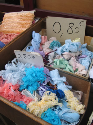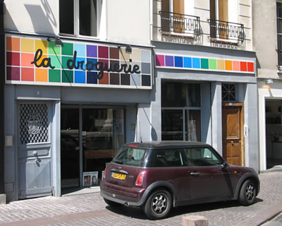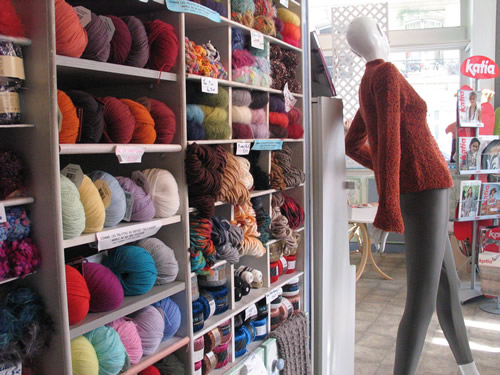 Kirkon vieressä on tunnelmallinen lanka- ja nappikauppa La Droguerie (9-11 rue du Jour, metro: Les Halles), jossa langat ovat esillä niin herkullisesti, että niihin on vaikea olla lankeamatta. Tarjolla on paljon kaupan omia, luonnonkuituisia lankoja jopa 10 gramman vyyhdeissä - mikä tietysti vihjaa, että taaskaan ei olla niillä halvimmilla apajilla. Kuidut ovat kuitenkin korkealuokkaisen tuntuisia ja värjäykset toinen toistaan hehkuvampia. Tässä kaupassa kannattaa käydä ihan vain katselemassa ja sormeilemassakin, sen verran on lankojen esillepanossa nähty vaivaa. Myös muuta neulomisvälineistöä on tarjolla kiitettävästi. Asiakkaita liikkeessä on yleensä sen verran, että palvelua voi joutua vartomaan.