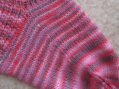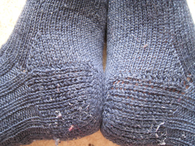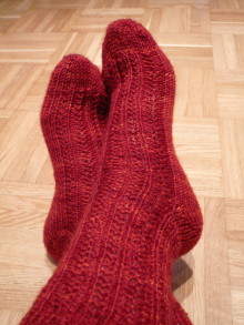Punaisesta langasta lähtee väriä pesussa, ensimmäisessä pesussa sitä lähti eniten, mutta useammankin pesun jälkeen vesi on aavistuksen punaista ja kuten kuvasta huomaa, ovat sukat haalistuneet parissa kuukaudessa melkoisesti. Sukan pohjat ovat huopuneet, mutta merkittävää kulumista en ole sukissa havainnut. Jotta värit eivät lätäköityisi, täytyy tiheyden ja silmukkamäärän olla juuri oikea. Jos lätäköiltä haluaa välttyä kokonaan, on tiimalasikantapää ainoa vaihtoehto.