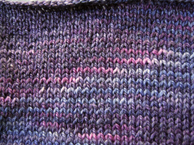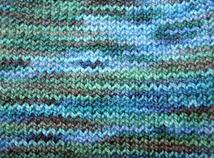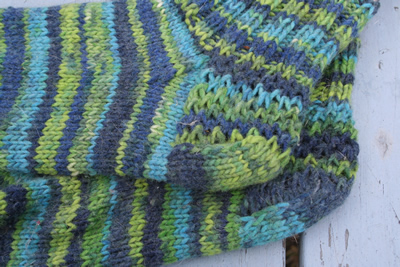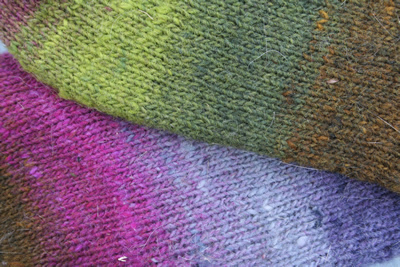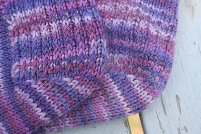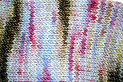 Neulottavana tämä lanka ei ole niitä kiitollisimpia. Hienoinen joustavuus tekee neulonnasta tahmeanlaista, ja terävämpi puikon kärki halkaisee herkästi langan ja nappaa vain pinnan kierresäikeitä. Tiiviiksi pinnaksi neulottuna lanka asettuu kuitenkin kauniisti eikä rosoisuus näy. Pätkävärjäys on luonnollisesti aina pätkävärjäys ja lopputulos on varsin kirjava, mutta värit ovat kirkkaat ja täyteläiset.