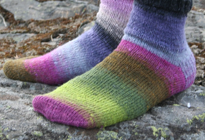 Lanka oli neulottaessa melkoinen unelma: pehmeää, joustavaa, tiukkakierteistä ja kimmoisaa, kuin Colinetten ihanaa Jitterbugia, mutta ohuempaa. Myös väri käyttäytyi kauniisti eikä läikittynyt tai raidoittunut. Yllätys tuli pestessä, sillä sukat lörpähtivät melkoisesti. Sopivan napakoiksi neulotut sukat muuttuivatkin pesussa hieman liian löysiksi. Jos siis pitää hyvin istuvista sukista, kannattaa Koigu-sukat jättää hieman liian tiukoiksi. Plussaa kuitenkin siitä, ettei väriä lähtenyt pesussa yhtään.