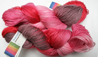 rantautunut käsinvärjätty sukkalanka. Kaksisäikeinen ja