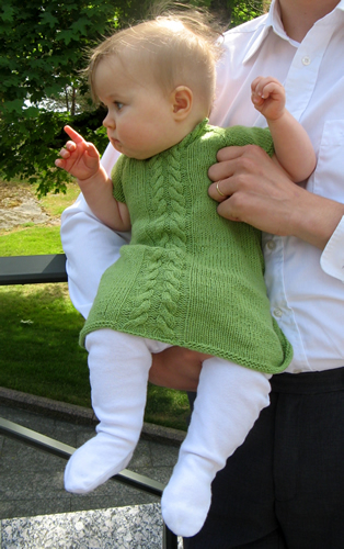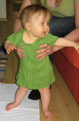 Aleena on vauvan kesäinen mekko/tunika. Yläosastaan melko istuva mekko pysyy päällä, muttei kuitenkaan kiristä ja suoralinjaisen helman alle mahtuu myös kestovaippa. Helma ylettyy polviin saakka eikä siis ole pahasti tiellä vauvan potkiessa tai ryömiessä. Mekko neulotaan lähes kokonaan pyöröneuleena eikä siinä ole yhtään ommeltavaa saumaa. Aleenasta saat helmaa jatkamalla myös selkeälinjaisen kastemekon.