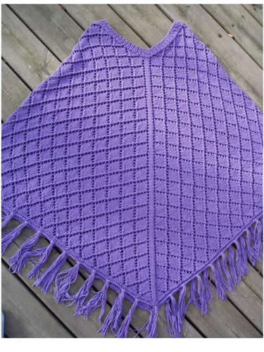 Jatka samalla tavalla, kunnes se on halutun pituinen. Kolmannessa mallikerrassa toistoja on 9, neljännessä 10 jne. Omassa ponchossani toistojen määrä valmiissa työssä on 27. Ota huomioon, että viimeisen mallikertakerroksen ennen alareunan kerroksia tulee olla 6. kerros. Neulo sen jälkeen yksi kerros nurin ja kaksi oikein. Tämän jälkeen päättele hyvin löyhästi.