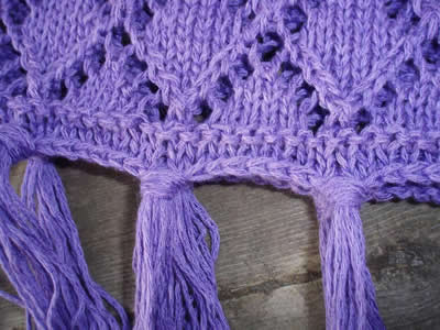 Leikkaa hapsuja varten langasta n. 18 cm pätkiä, laita hapsut jokaisen kokonaisen salmiakkikuviorivin alareunaan.