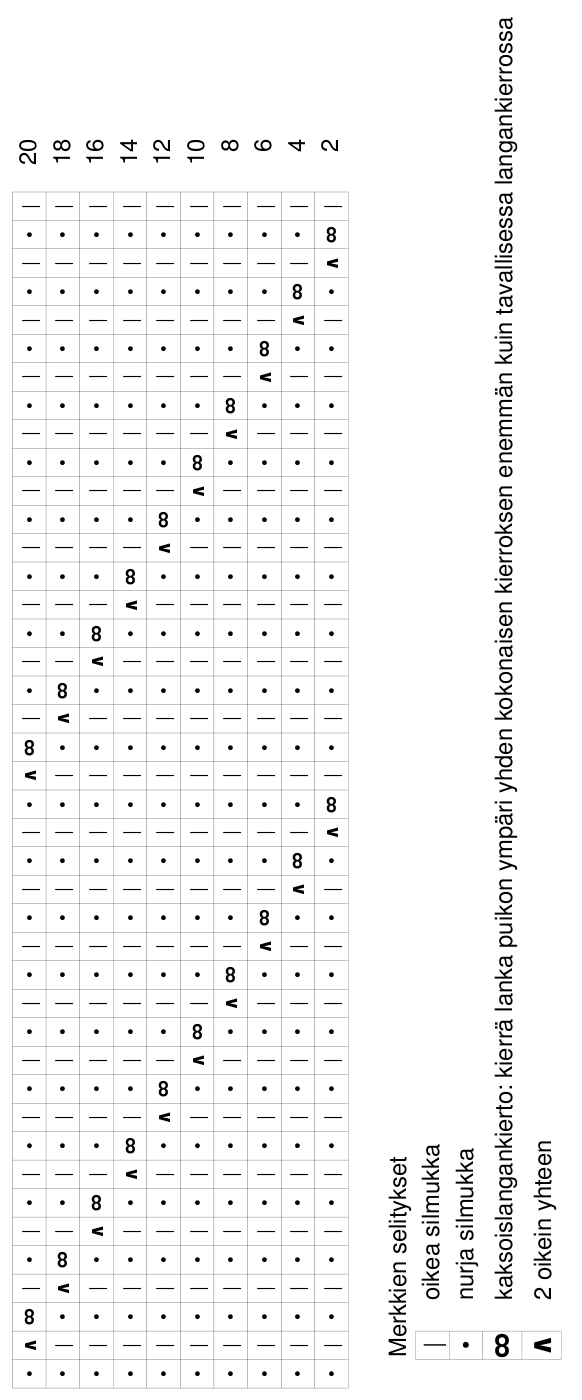 Jatka tämän mallin mukaan, kunnes puikolla on 18 silmukkaa ja olet viimeksi neulonut *lisää 1, 8 o* (tai kunnes yhden kuvion leveys on noin 5 cm ja olet viimeksi neulonut parillisen kerroksen).
